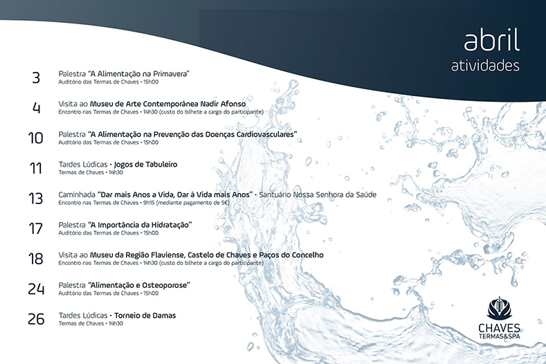 O programa inclui ainda as Tardes Lúdicas que, no dia 11 de abril, é dedicado a jogos de tabuleiro e no dia 26 ao tradicional jogo de damas. Estas iniciativas decorrem nas Termas de Chaves, pelas 14h30 e o grande vencedor terá direito a um prémio.